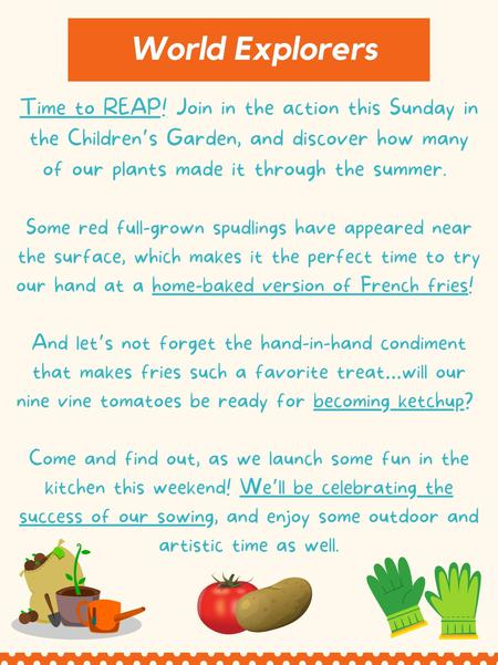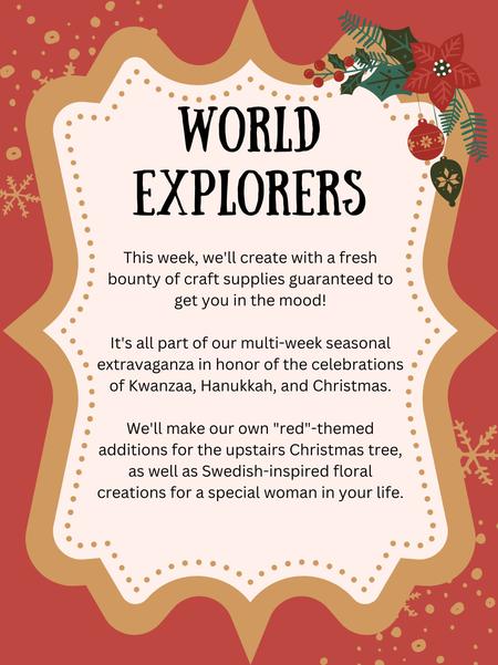 These graphics include flyers for the World Explorer's Children's Program, where a different service-based project is introduced each week to be completed after Sunday service. The remaining graphics are announcements for church-related programs and/or inquiries.